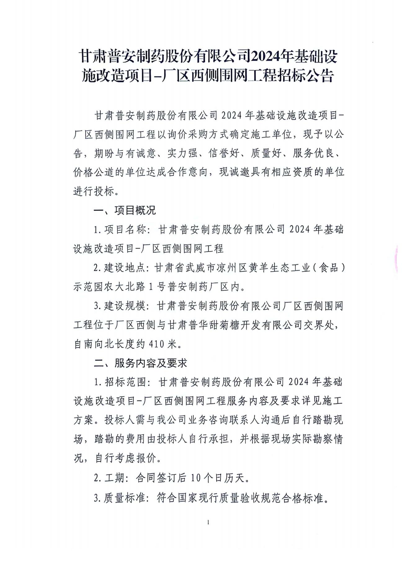 甘肅普安制藥股份有限公司2024年基礎(chǔ)設(shè)施改造項(xiàng)目-廠區(qū)西側(cè)圍網(wǎng)工程招標(biāo)公告